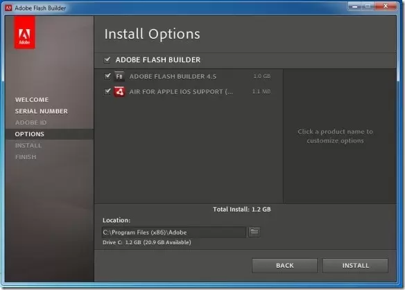 During installation you will be given the option to install Air for Apple iOS support, make sure this option is checked. You will require more than 1GB of empty space on the disk you are installing Adobe Flash builder. During installation you will also be given the option to either enter a key or to continue with the 60 day trial. You can even install the Flash Builder in other languages by selecting an alternative language during the installation. The installation may take a few minutes as Adobe Flash builder is quite a resource intensive application.