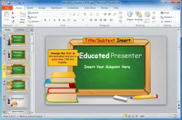 Educational presentations can often appear to be dull and boring for students, since the content can be complex and intimidatingly long! To create interest among students, teachers can use attractive PowerPoint Templates for making more attractive presentations. The Educated Presenter PowerPoint Template is one such template which brings animated, editable sample slides to help teachers create interesting presentations.