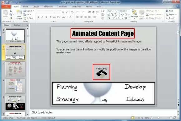 The below screenshot shows the animated content page which has placeholders for adding a logo and text. The added content to this slide will appear in animated form (in slideshow mode). You can use this and other such slides within this template to create multiple animated slides. If you prefer not to use the template, you can also create the objective slides in PowerPoint from scratch.