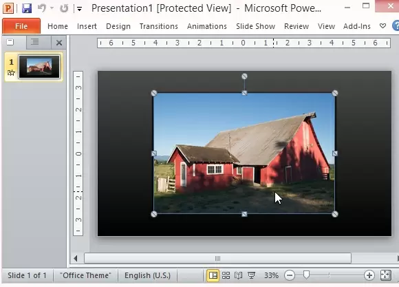 With the slide animation template, you can see that it has three different photos. The first one is a shot of a farm from a far angle and as you switch to the succeeding two slides, you can see that the photo zooms in much nearer to the red bard at the far end of the farm.