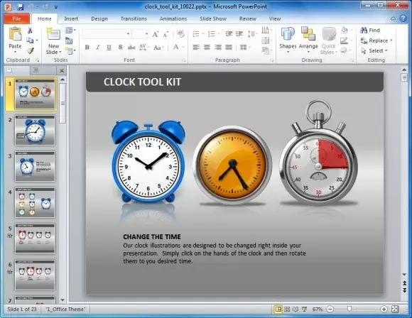 The Clock Toolkit is another time related PowerPoint template with timelines, charts, clipart and animations. Whether you require creating a PowerPoint Timeline or a time management related presentation, this template is perfect for the job. It comes with different customizable images of analog clocks, including a stopwatch, which can be adjusted by moving the hands of the clock. While it does not provide a stopwatch for countdowns, the template does offer images that can be used for depicting a stopwatch as a static image.