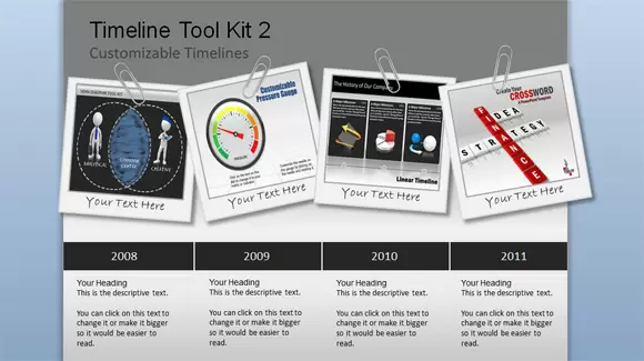 The toolkit contains different samples of timelines that you can use for your own needs, for example this timeline with pictures for PowerPoint with clips and different editable picture placeholders that you can change. Alternatively, you may choose to download a free timeline template with a timeband and ready for Microsoft PowerPoint presentations.