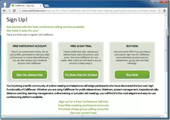 To use Calliflower you will have to sign up for a new account. The Sign Up page provides three types of account options, including a 14-day trial account, a free participant account and the option to sign up for the full version by buying a package. Buying a package provides the user with 30 days of free Calliflower service, access to over 200 major cities and 30 countries, MP3 recording, text chat, an interactive Dashboard and other robust conference call options.
