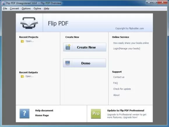 When launched, Flip PDF provides two basic options, i.e. to create a new project or to view the video demo. The video demo provides a detailed overview of how you can use Flip PDF for creating and sharing PDF files in the form of booklets with flipping animation.