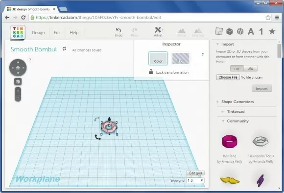 The menu on the right provides all the necessary tools for making your 3D models with the help of Geometric Shapes, make new shapes using the New Shape Generator option, fetch designs available from community members an even import 2D or 3D shapes via file or URL. To start making your model, just drag and drop shapes to the Workingplane.