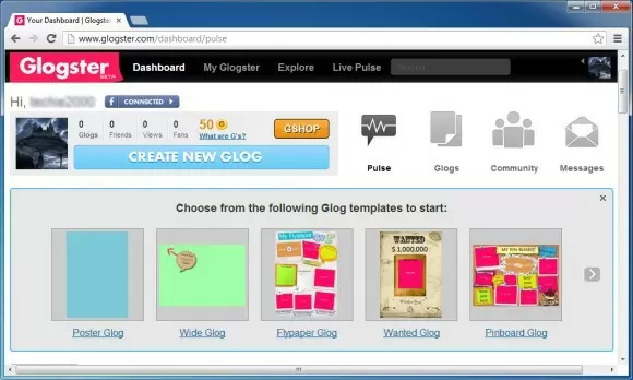 To create your Graphic Blog (Glog), sign in with a Glogster account or via your Facebook profile. Once logged in, you can select a Glog type to begin working on. The available options include; Poster Glog, Wiki Glog, Flypaper Glog, Wanted Glog, Pinboard Glog, Games Glog, etc. These Glog types are basically readymade templates that can be used for making a blog post, wish list, Wiki style page, a presentation with features more interactive than PowerPoint or even a picture of your friend with a Wanted sign.