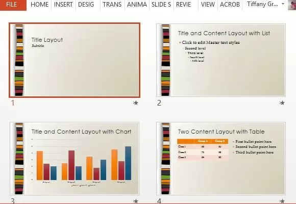 The look is also echoed in the sample tables, charts, and diagrams in the slide template. These objects incorporate the colors found in the tie, making your presentation look cohesive and professional, even though the slides have different layouts.