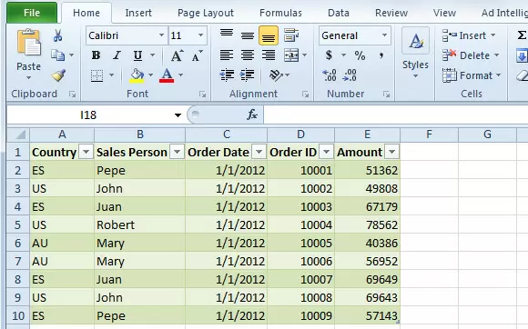 Here we will see how to create a simple pivot table to see how it works, based on the following table with sales amounts per sales person, country, order date and order ID.