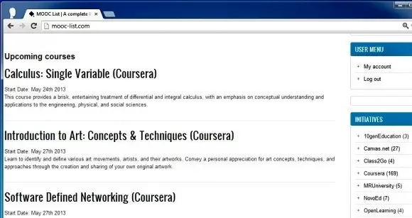At MOOC List you can search for courses by category. The left side menu displays courses by “Initiative”, which is basically a sort of categorization of online courses according to certain educational learning platforms. For example, one of the listed initiatives include 10genEducation, which are free courses to help people learn MongoDB. This initiative is available for anyone who can access it online. After the course is complete, students are given a certificate of completion from 10gen, alongwith membership of the 10gen’s community of cutting-edge NoSQL technologists.