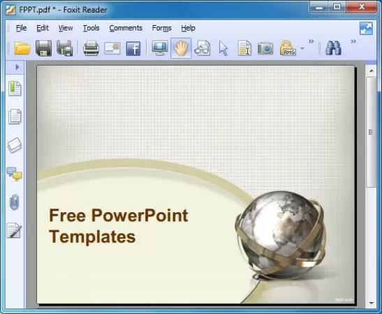 Some of the major features of Foxit Reader include; its ability to modify a PDF document, add/verify digital signatures, add comments, highlight, strikeout, insert and underline specific parts of a document, measure distances /area of objects (within a document), use the Typewriter tool for filling forms, sharing options for social networking websites, XFA form support, spell checking and bookmarking utility, enhanced security and more. The below image shows the Foxit Reader interface. The document in this image has been created from our Investor PowerPoint Template.