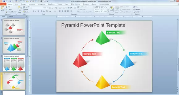 Inside this free pyramid PowerPoint template you can find four unique slide designs with different pyramid schemes and layouts. For example, you can download free pyramid 3D PowerPoint template to make a comparison slide with a three column slide design layout for MS PowerPoint. Or you can download and use the 3D template for PowerPoint with the pyramid objects distributed inside a 3D surface.