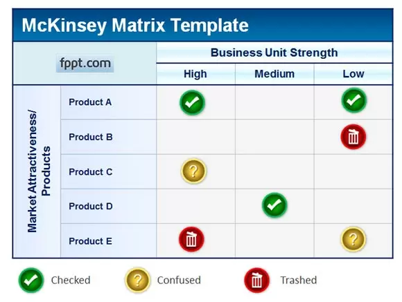 You can also download Harvey Balls PowerPoint template and combine both templates to make a nice PowerPoint for profitability analysis using Harvey Balls with arrows instead of these pre-made icons (tick, question icon or trash icon). Instead, you can use this McKinsey Matrix template plus Harvey Balls to produce a PowerPoint diagram like the following example: