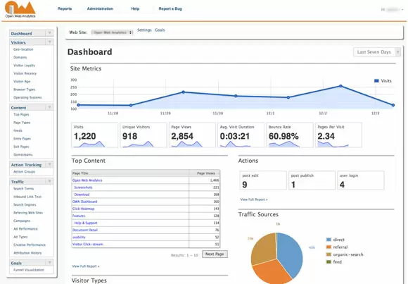 Open Web Analytics (also known as OWA) is an open source web analytics platform that you can install and use to track and analyze how people use your websites and applications. OWA is licensed under GPL and provides website owners and developers with easy ways to add web analytics to their sites using simple Javascript, PHP, or REST based APIs. Open Web Analytics also comes with built-in support for tracking websites made with popular content management frameworks such as WordPress and MediaWiki.