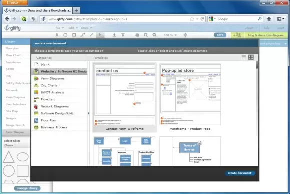 By default Gliffy comes with a number of templates for creating website and software UI designs, Venn Diagrams, Organizational Charts, Flowcharts, Network Diagrams, Software and UML Designs, Floor Plans, as well as Business Process and SWOT Analysis models. You can start off by simply selecting a model from the available categories or start with a blank template.
