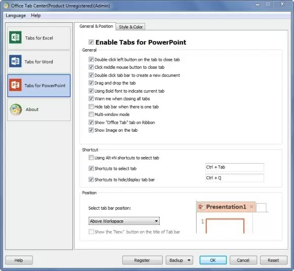 - Configure shortcut keys and select tab position