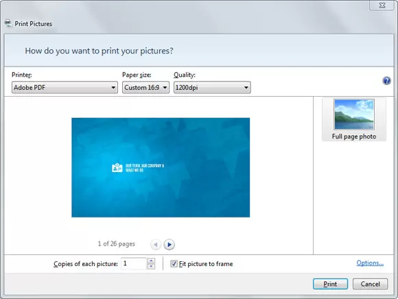 This will open the following Print Pictures window. Here you can choose the printing options and we will select PDF as the output. If you have a PDF software like Adobe PDF or Nitro PDF then you should see these options under Printer combo.