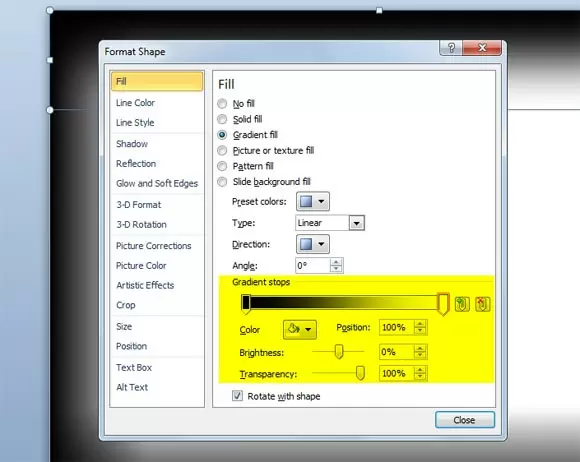 To get this effect, you must change the Format Shape options and choose the following gradient stops. Make sure to use 100% value for Transparency for the white stop but 0% for the black stop color.