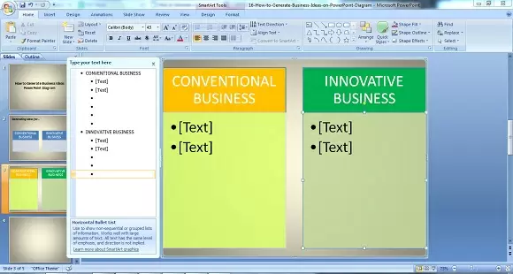 Going by its definition, the said SmartArt is used to present non-sequential blocks of information with each step or point with the same level of importance or emphasis. Like when you are presenting the two different types of businesses, (conventional and innovative businesses), it can be assumed that you will be placing or adding different ideas on how to generate ideas. The said SmartArt could serve as your summary board wherein you list down all possible ways or means on how to generate ideas.
