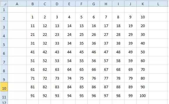 Now, under the 1, enter a formula given by =B2+10, where B2 is the cell where you added the number 1. Copy and paste it horizontally 10 times and then vertically 9 times (because the first line was entered manually).