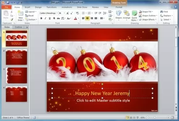 There was a time when people with a creative bone in their body made cards with paper, glitter, crayons, oil paint and other items they could use to craft something special. This has now been replaced by applications which work just is good, with means of delivery better than the post office. To use PowerPoint for this purpose, simply download an appropriate template to make your job easy. For example, to create a new Year card you can use New Year PowerPoint Templates. For the purpose of this post, we will use the Free New Year PowerPoint Template.