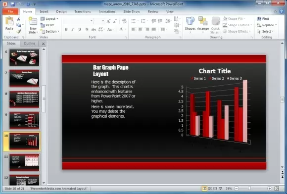 The template not only provides an animated introductory slide with a maze animation but also offers everything from editable charts to SmartArt Graphics, generic clipart and eye-catching sample slides. While the slides are highly customizable, you can edit out many of these sample slides to create a compelling presentation in no time.