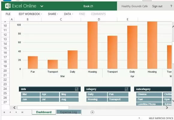 This Excel Online template contains two worksheet tabs, namely Dashboard and Expense Log. The Dashboard contains a huge bar graph of the expenses. Below are viewing buttons such as Date, Category and Subcategory that allow you to select what type of information you want to view. This way, you can go back to your monthly expense history and view which month or expense category or subcategory to see how you have spent your finances in those areas.