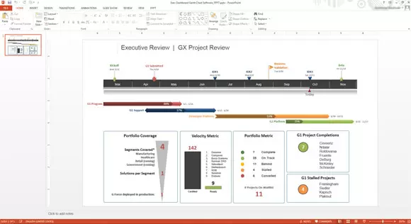 The template you use to show a Gantt Chart in a PowerPoint presentation should provide a timeline, key milestones, the critical tasks, and a percent completion graphic to show progress. Anchoring your scorecard with a visual Gantt chart or timeline quickly and clearly communicates project status to executives and clients.