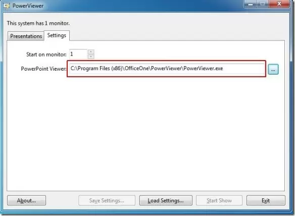 To use PowerViewer you will require PowerPoint Viewer 2007 or PowerPoint Viewer 2010. After Powerviewer is installed, simply launch the application and specify the path for the EXE file via the Settings tab. You should be able to find the PowerViewer.exe file in C-> Program Files –> OfficeOne-> PowerViewer.