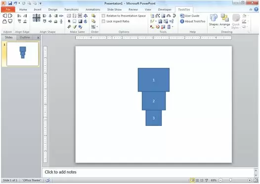 Upon installation, ToolsToo adds a new tab to PowerPoint. This tab contains all the available features that you will require to create better presentations. The sections within the ToolsToo tabs include Align Shape, Make Same, Tools, Help and Drawing. Since we are using the lite version for testing purposes, it is worth mentioning here that the paid version provides more tools than the free version.