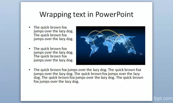 In this example above, we placed a world map picture in the slide design, and then we added some paragraphs with bullet points at the left; you can learn how to wrap text in PowerPoint.